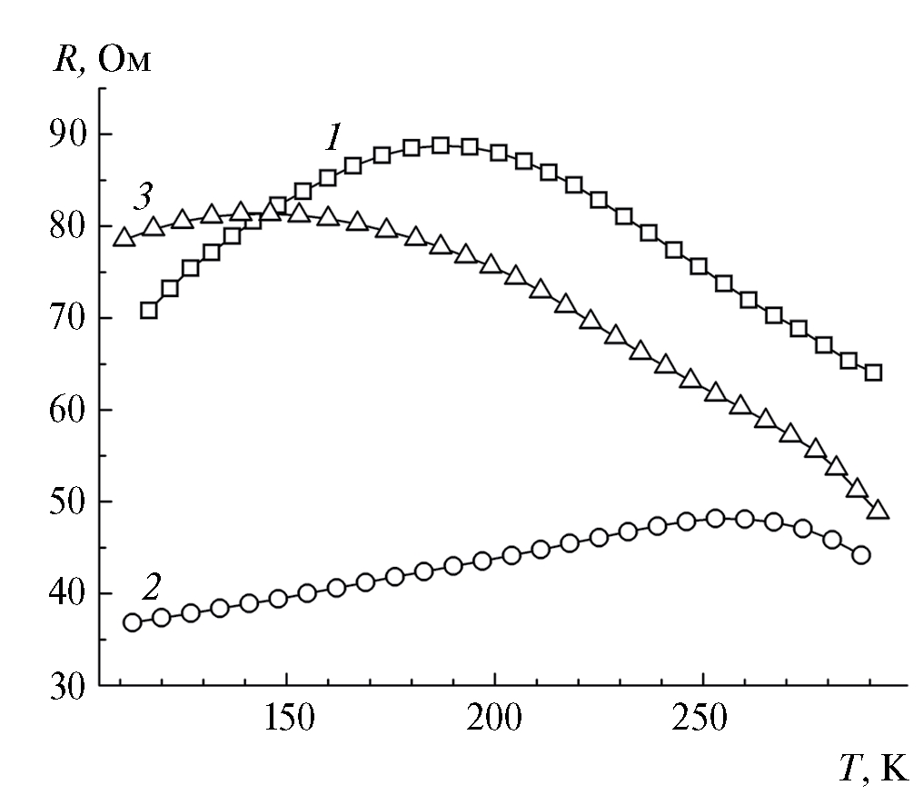 Электрические характеристики измеряли с помощью контактов, изготовленных из самозатвердевающей металлоорганической смеси, содержащей 99 % серебра. Температуру перехода металл-полупроводник (Tms) определяли по пику температурной зависимости сопротивления. Измерения магнитосопротивления [MR = (R(H)–R(0))/R(H)] проводили в магнитном поле напряженностью H = 9.2 кЭ.