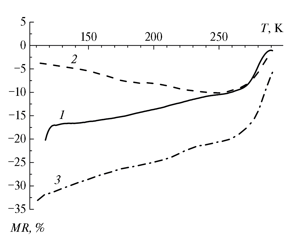 В остальных образцах |MR| увеличивается с понижением температуры, что обычно связано с туннелированием спин-поляризованных носителей заряда через границы зерен или между ферромагнитными кластерами. Максимальная абсолютная величина магнитосопротивления достигает 33 % при 110 К в Mg-содержащем манганите.