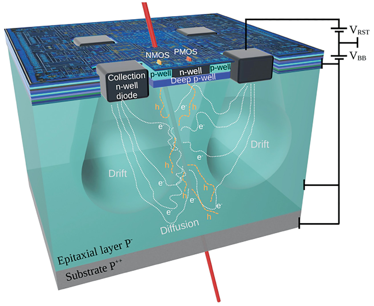 В новой ВТС-2 эксперимента ALICE в настоящее время работают МАПС c размерами транзисторных компонент 180 нм и оксидной толщиной затвора менее 4 нм, что дает преимущества в контексте радиационной стойкости детекторных комплексов [13]. МАПС состоит из эпитаксиального слоя с высоким удельным сопротивлением (~1 кОм·см), выращенного на подложке с низким удельным сопротивлением (толщина может варьироваться от 14 до 65 мкм), матрицы собирающих диодов (пикселей) и КМОП front-end электроники с толщиной металлизации порядка 11 мкм. Эпитаксиальный слой является активным объемом детектора с толщиной 25 мкм. Диод, собирающий заряд, реализован как переход между эпитаксиальным слоем и карманом n-типа (n-well). Размер обедненной носителями заряда зоны можно изменять, подавая напряжение смещения VRST. Чтобы дополнительно увеличить ширину обедненной зоны, можно еще подать напряжение обратного смещения VВВ на подложку детектора. Сбор зарядов осуществляется как путем дрейфа (в обедненной зоне), так и диффузии (в остальном объеме). Поэтому заряд от одной частицы (даже для треков, перпендикулярных плоскости пиксельной матрицы) может собираться на нескольких соседних диодах (пикселях), образующих так называемый кластер. Процентное соотношение сбора заряда за счет дрейфа и диффузии определяется размером обедненной зоны, так что VВВ также может влиять на размеры кластера. Таким образом, включение в схему питания сенсора напряжения обратного смещения VВВ, подаваемого на подложку, позволяет в значительной степени увеличить обедненную зону вокруг собирающего заряд диода и понизить входную емкость пикселя, что приводит к более эффективному сбору заряда и уменьшению шумов. Для повышения эффективности работы детектора в области front-end электроники располагается глубокий карман p-типа (p-well). Уже над ним размещаются элементы электронных схем детектора, реализованных с использованием PMOS структур с карманом типа n-well (зазор между карманами n-well и p-well типа составляет 3 мкм). В итоге карман p-типа экранирует электронику пикселя, не допуская сбора электронов на n-well и тем самым появления дополнительных шумов [30, 31]. Схематически основные компоненты МАПС представлены на рис. 1.