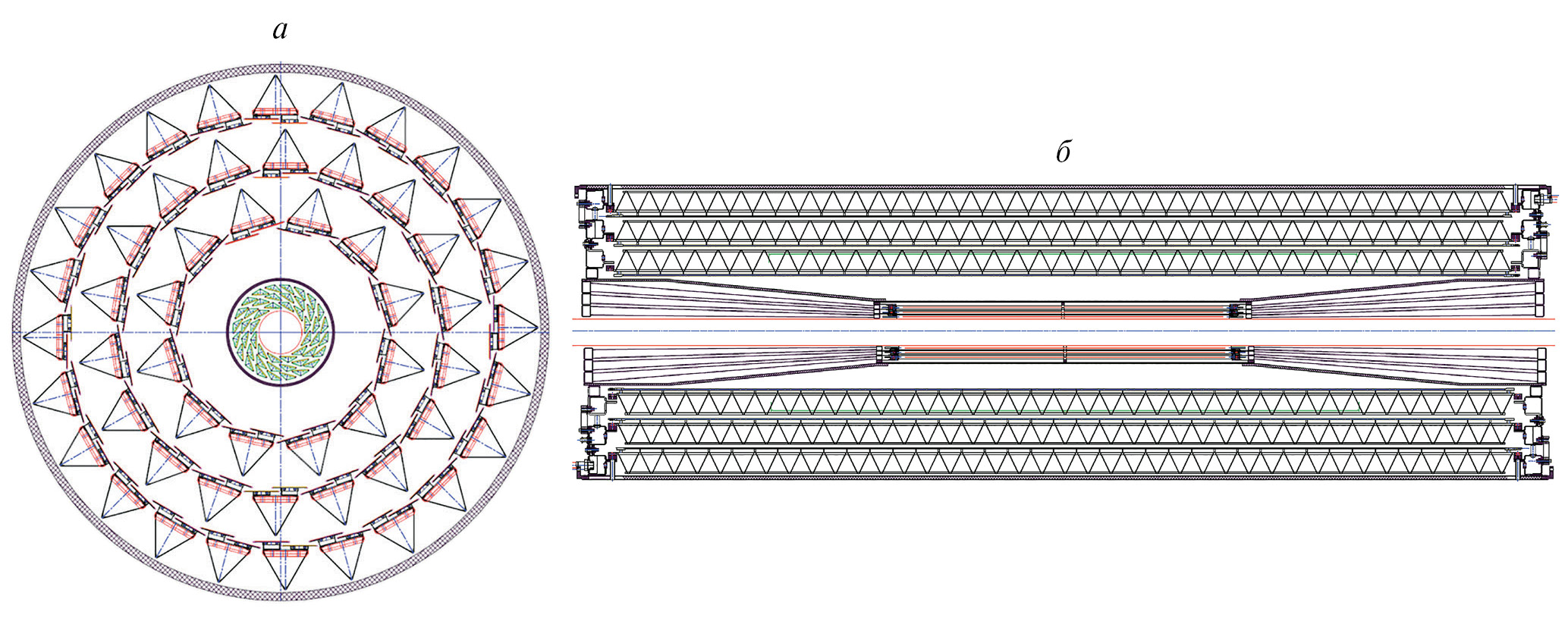 Рис. 2. Модифицированная концепция вершинного детектора эксперимента MPD: геометрическая модель вершинного детектора (поперечный разрез) (a), продольный разрез вершинного детектора (б).