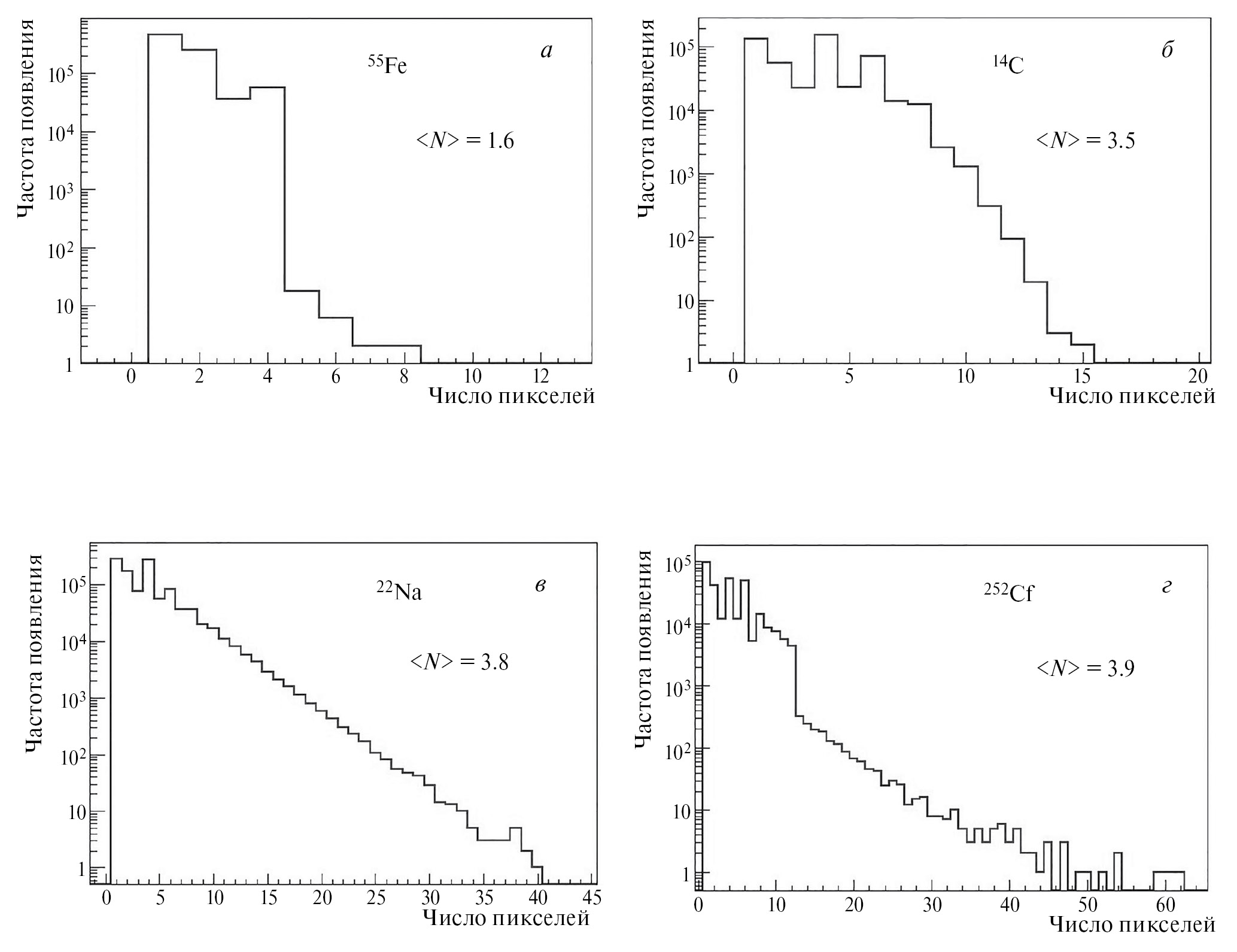 Рис. 3. Частота появления кластеров с определенным количеством пикселей при облучении МАПС источниками: гамма-квантов — 55Fe (а), бета-частиц — 14C (б), источников смешанных гамма и бета излучений — 22Na (в), альфа-частиц и осколков деления — 252Cf (г).
