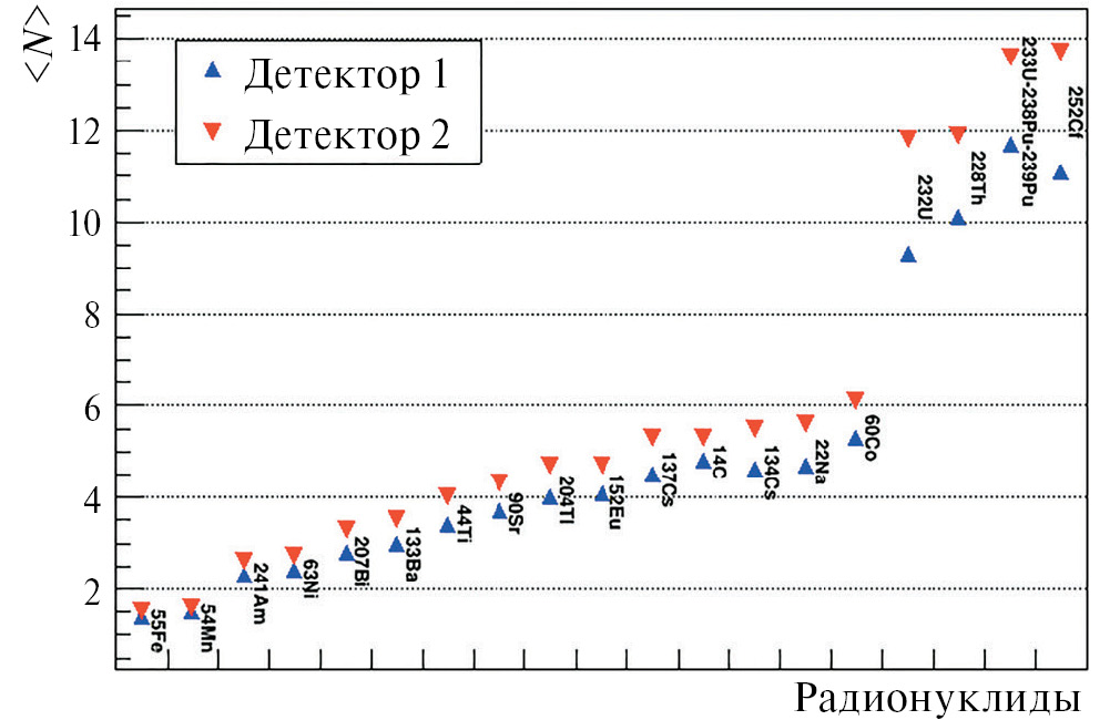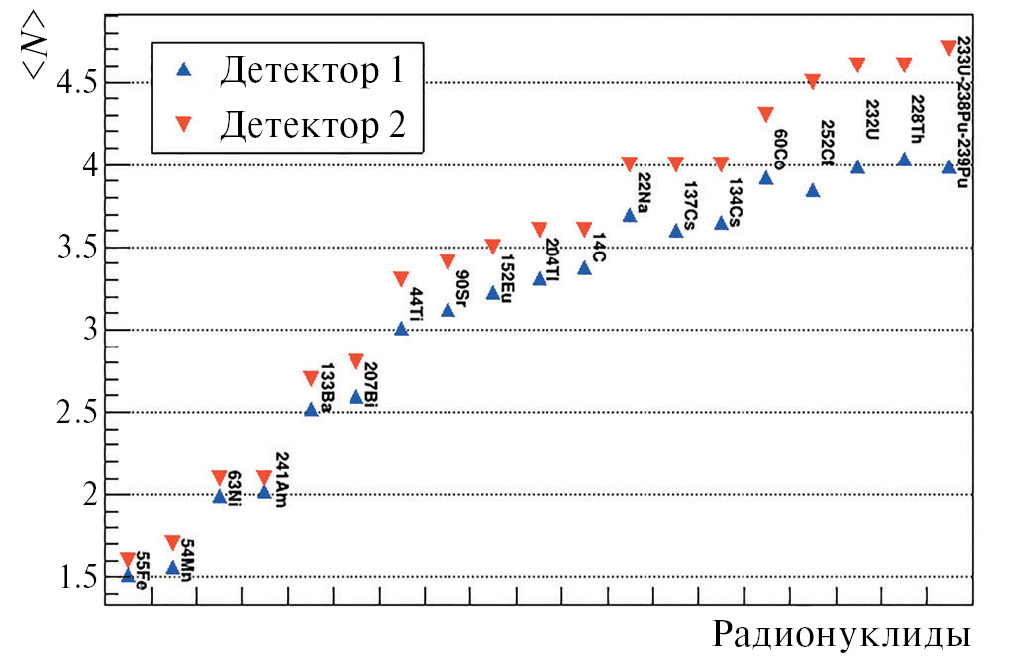 Рис. 5. Средняя множественность пикселей в кластерах <N> при облучении пиксельной матрицы детекторов МАПС источниками: гамма-квантов, бета-частиц, смешанных источников гамма и бета излучений, альфа-частиц и осколков деления. К подложке детекторов МАПС не приложено обратное смещение VВВ.