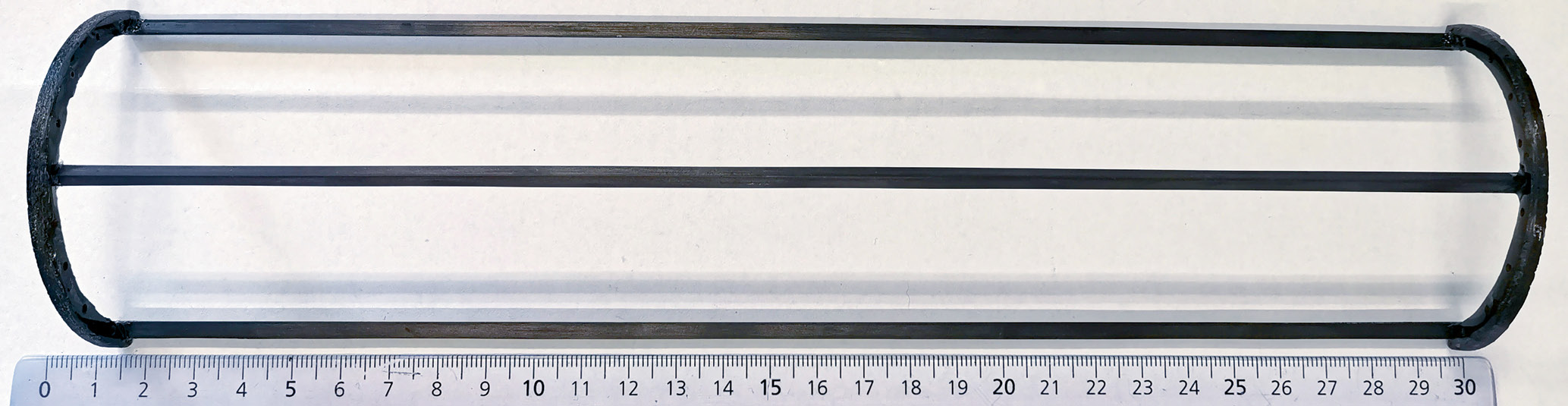 Проведенные расчеты показывают, что для надежной идентификации адронов, содержащих тяжелые кварки, с пробегами менее 100 мкм при малых поперечных импульсах следует выбирать детекторные модули с минимальным количеством кремниевого материала на слой (тем самым увеличивая радиационную прозрачность всей внутренней трековой системы) и размещать эти модули в виде цилиндрических слоев как можно ближе к точке столкновения пучков коллайдера NICA. Дополнительно снизить количество вещества в системах поддержки и охлаждения МАПС можно за счет реберных конструкций, состоящих из сверхлегких углекомпозитных структур (см. рис. 5). На рис. 6 показан каркас, изготовленный из углекомпозитных ребер по технологии, разработанной авторами при создании ферм сверхлегких структур поддержки детекторов на основе МАПС для ВД эксперимента MPD на коллайдере NICA с использованием препрега отечественного производства [45]. На такие каркасы предполагается монтировать согнутые в цилиндрические слои ультратонких (20—40 мкм) кремниевых МАПС большой площади с газовым охлаждением и термоизоляцией от внешних слоев посредством тонкой (10 мкм) металлизированной ПЭТ-фольги. В итоге общий вклад материала на каждый слой будет уменьшен до рекордных 0.084 % Х0.