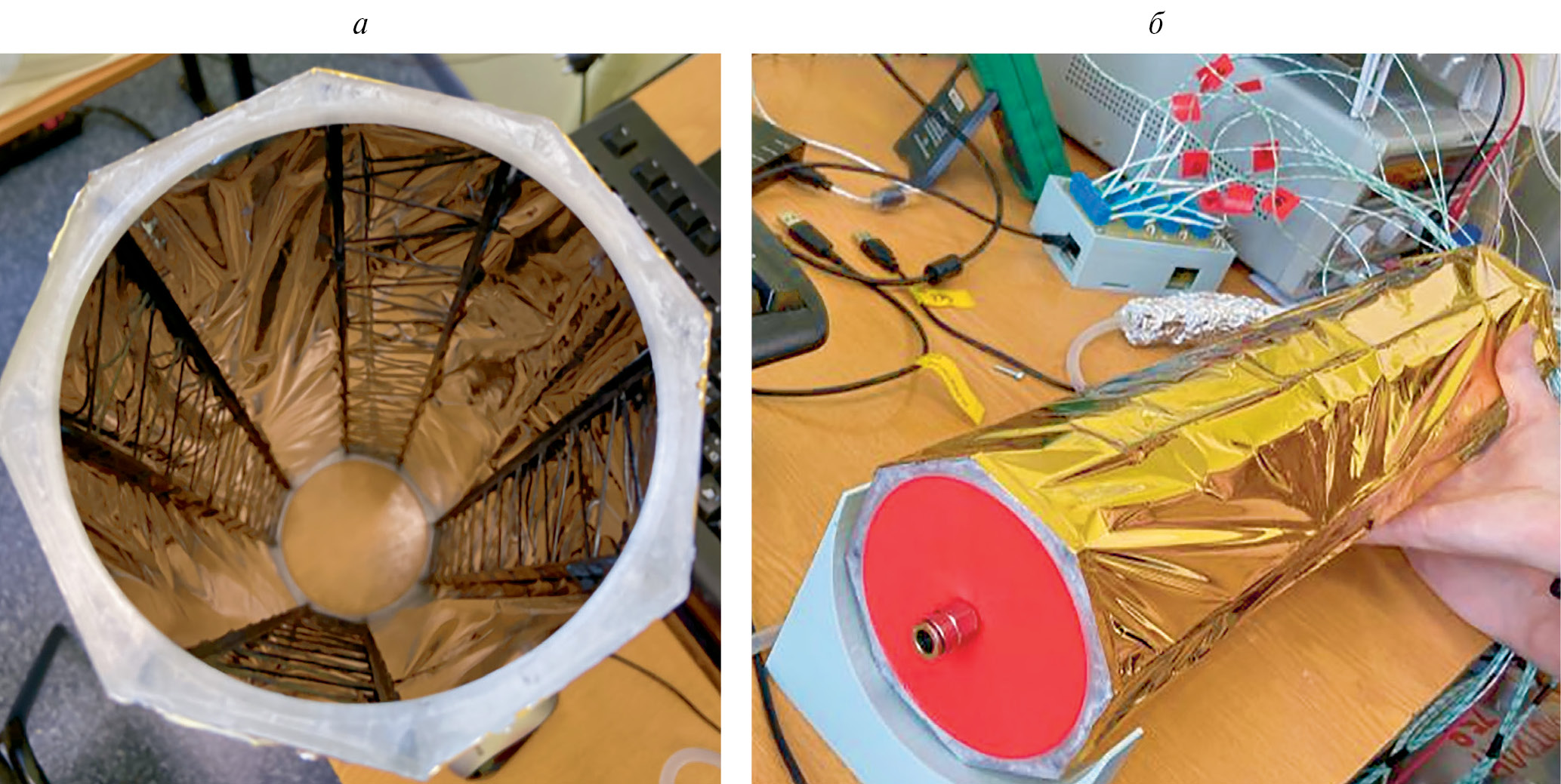 Каркас криогенного модуля выполнен из продольных частей углекомпозитных ферм сверхлегких структур поддержки детекторов на основе МАПС [45] с термоизоляцией, которая достигается с использованием нескольких слоев 10 мкм металлизированной ПЭТ фольги (см. рис. 8а, 8б). Внутри криогенного модуля с помощью специальных колец-держателей устанавливается цилиндрический детекторный слой (нитевидное стекло) по параметрам близкий к кремнию, используемому в МАПС с инкапсулированными внутрь нихромовыми нитями. На нихромовые нити подается ток определенной величины, тем самым имитируя тепловую мощность (от 5 до 50 мВт∙см-2), выделяемую детекторами в ходе их работы.