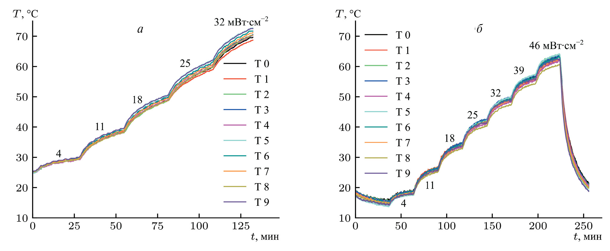 В ходе проведенных экспериментов температура газообразного азота на входе в криогенный модуль устанавливалась и поддерживалась на уровне +15 оC. На рис. 8 представлены температурные зависимости, которые получены с поверхности детекторного слоя. На рис. 9а показано распределение температурного поля на поверхности детекторного слоя без газового охлаждения для подводимой к нему тепловой мощности: 4, 11, 18, 25, 32 мВт∙см-2, а на рис. 9б с охлаждением холодным азотом, подаваемым в криогенную камеру с двух сторон (комбинированная схема), с тепловой мощностью, подводимой к детекторному слою: 4, 11, 18, 25, 32, 39, 46 мВт∙см-2.