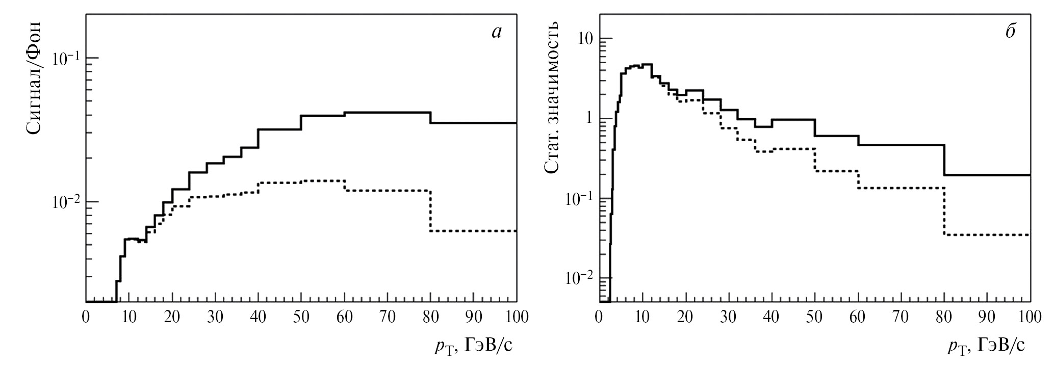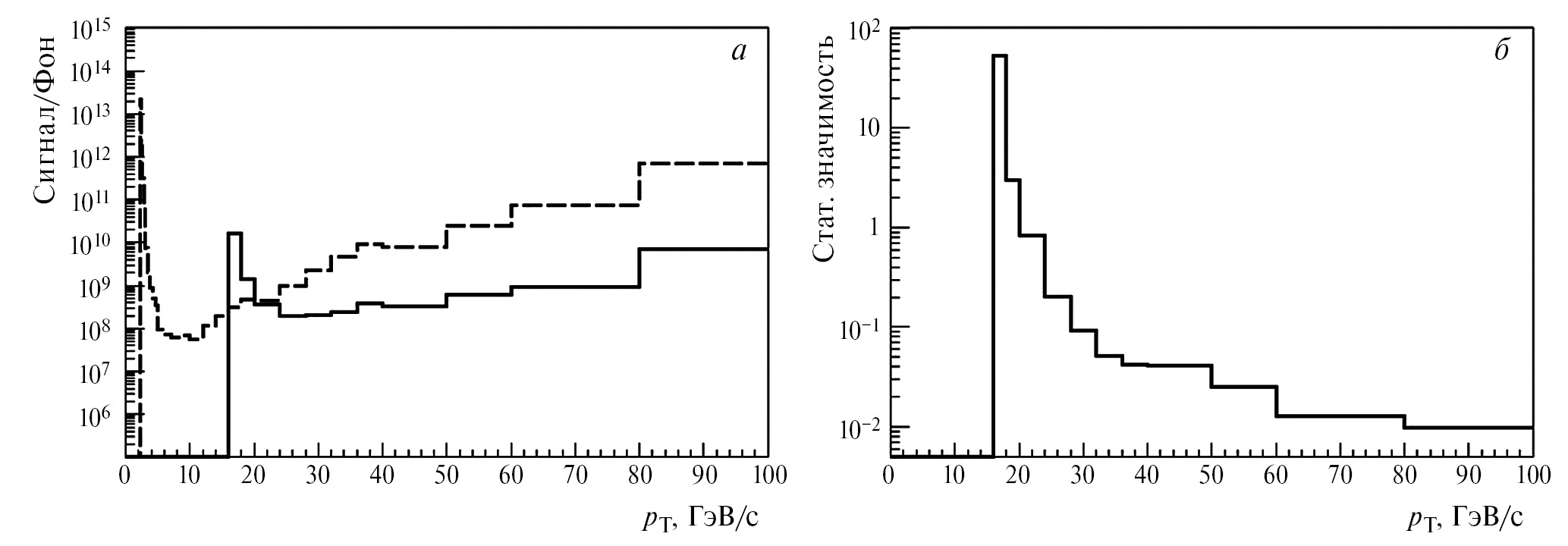 Рис. 2. Отношение сигнал-фон (а) и статистическая значимость (б) для реконструированных сигналов от D0 → π+ + + K– + π0 распадов в Pb+Pb столкновениях при энергии = 5.5 ТэВ.