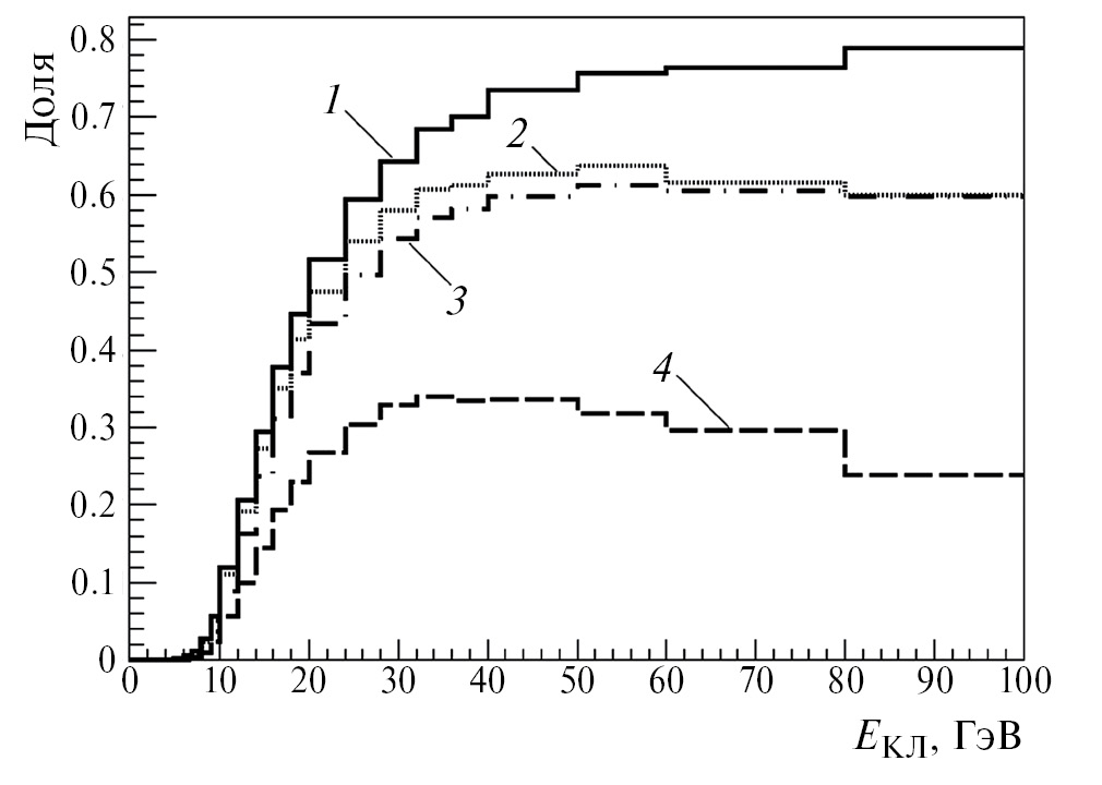 На рис. 4 представлена оцененная эффективность регистрации распадов D0 → π+ + K– + π0 в Pb+Pb столкновениях при энергии = 5.5 ТэВ. Линия 1 была получена для случая идеального детектора при отсутствии эффекта слипания кластеров. Линия 2 была получена при применении подхода БСК, а линии 3 и 4 соответствуют применению подхода СК и СК с дополнительным требованием для минимального поперечного импульса нейтрального пиона pT > 20 ГэВ/c соответственно. Исключение слипшихся кластеров из анализа значительно понижает эффективность восстановления сигнала при увеличении поперечного импульса частиц. С другой стороны, подход СК не работает в области малых и промежуточных значений поперечного импульса, но его эффективность приближается к значению эффективности для идеального детектора в области больших поперечных импульсов.