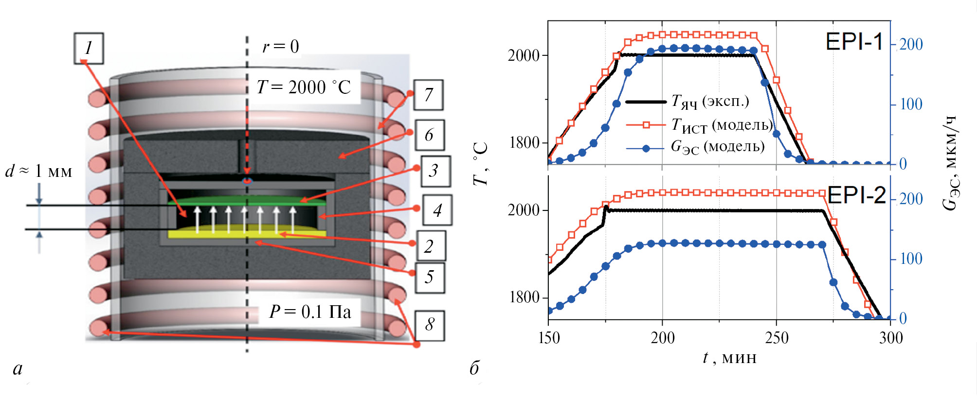 Для получения более детальной информации о распределении температуры внутри ячейки, оценки динамики процесса осаждения и состава паровой фазы в процессе эпитаксии были использованы методы численного конечно-элементного моделирования. Конечно-элементная модель рассчитывалась в программном пакете мультифизического моделирования COMSOL Multiphisics с использованием геометрии теплового узла, сэндвич-ячейки, физическими свойствами применяемых материалов [5]. В качестве входных параметров использовались экспериментальные данные серии процессов EPI-1—4. Последовательность расчета: 1) решение уравнений теплопереноса (теплопередача в твердых телах и радиационный теплоперенос) при индукционном нагреве с использованием экспериментальной кривой нагрева и температурозависимых свойств материалов в диапазоне 300—3000 K; 2) решение уравнений свободномолекулярного массопереноса в зазоре источник-подложка. В результате была произведена оценка основных параметров процессов и их общая динамика. Рассчитанная динамика температуры источника Tист(t) в сравнении с экспериментальной кривой температуры крышки сэндвич-ячейки Tяч(t) и скорости роста GЭС(t) процессов EPI-1 и EPI-2 показана на рис. 1б.