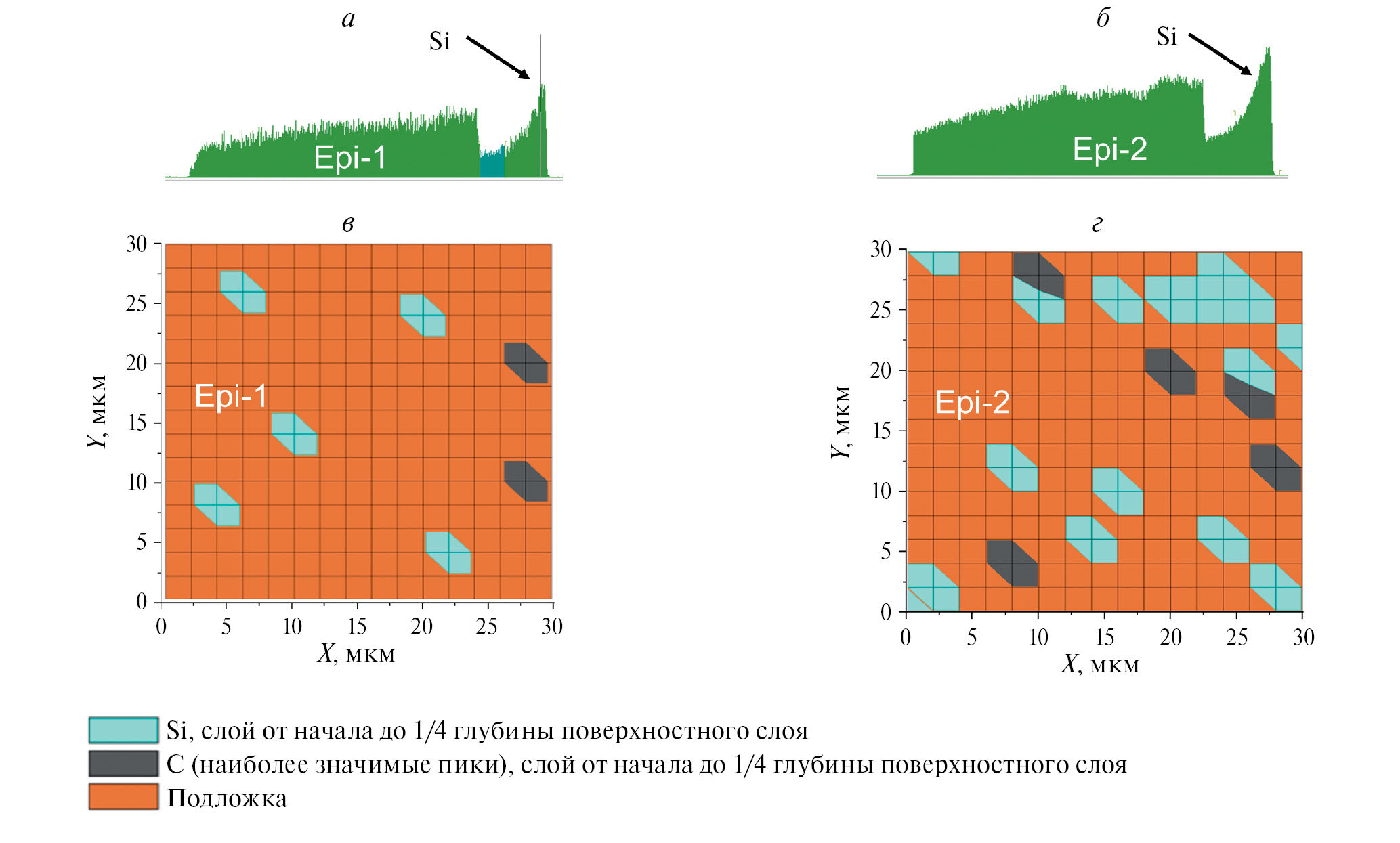 Специальная математическая обработка RBS-спектров с целью получения интегральных элементных карт показывает, что в поверхностных слоях есть участки с повышенным содержанием Si, углерода (C) и сочетанием Si-C, которые расположены изолированно в виде островковых образований. Пики выделяют структуры с повышенным содержанием компонент относительно усредненных значений на подложке (рис. 3в и 3г).