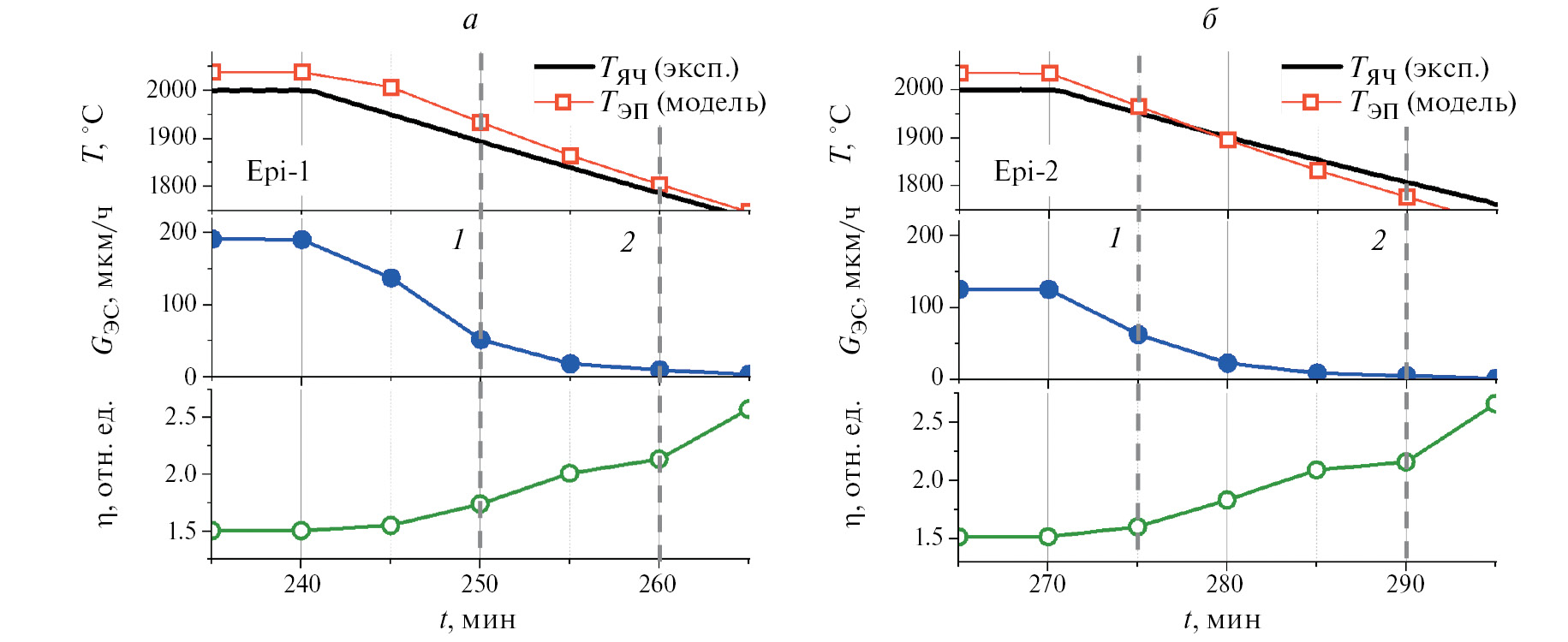 В табл. 2 приведены основные рассчитанные параметры процессов эпитаксии EPI-1 и EPI-2 из которых можно видеть, что положение подложки относительно индуктора определяет осевой перепад температур ΔT источник-подложка. Рассчитанная стехиометрия η компонентов (Si/C) паровой фазы на стадии выдержки η равна 1.52 и 1.55 для EPI-1 и EPI-2, соответственно. Наилучшая сходимость толщины hЭС и скорости роста GЭС была получена при значениях коэффициентов сублимации и прилипания δ = 0.03 и α = 0.65 соответственно, что согласуется с литературными данными моделирования подобных сэндвич-ячеек [6].