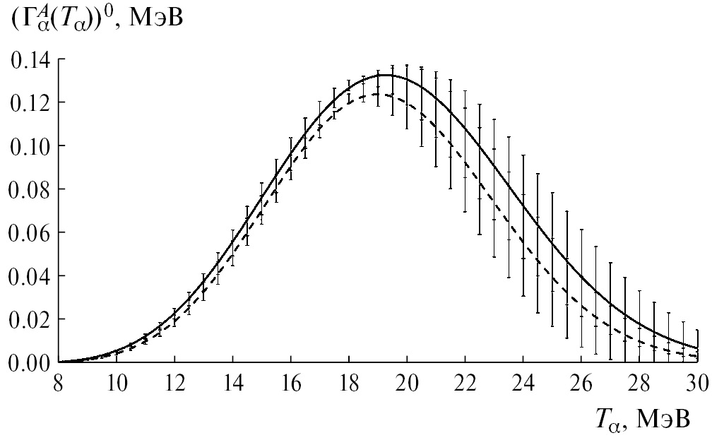 Рис. 1. Ширина вылета α-частиц из шейки предразрывной конфигурации делящегося ядра 252Cf, где штриховая линия — (s, f), сплошная линия — (nth, f).