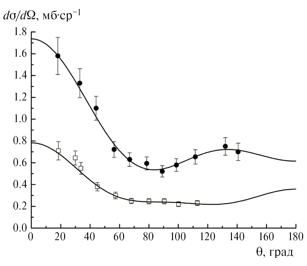 Рис. 3. Дифференциальные сечения реакции 19F(d, t0) для Ed = 6.99(1), 7.99(1) МэВ обозначены соответственно как □ и ●, линии — описание рядом из полиномов Лежандра.