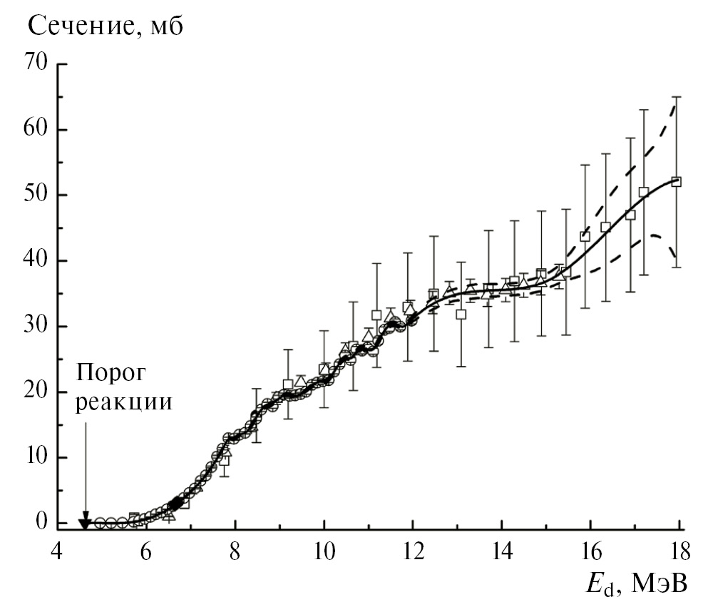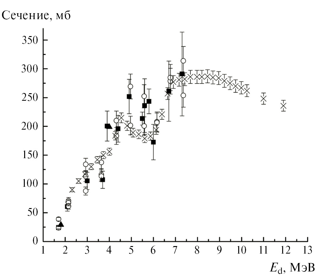 Цель настоящей работы — оценка сечений этой реакции, состояние с экспериментальными данными которой показано на рис. 1. Видно, что наши данные [12] в относительной энергетической зависимости хорошо согласуются с данными [13], однако в абсолютных значениях превышают их в 1.3 раза. Результаты другой работы [14], выполненной на циклотроне, если уменьшить их эффективные энергии дейтронов на 1.4626 МэВ, будут совпадать с данными [13]. Других исследований по этой реакции не найдено.