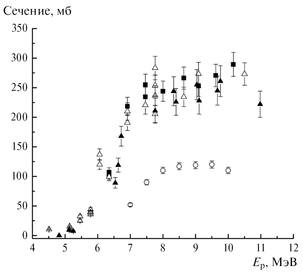 Рис. 7. Сечения реакции 7Li(p, xt) (■ — настоящая работа, серия 1; Δ — настоящая работа, серия 2; ▲ — [7]; ○ — 7Li(p, p2)7Li*(4.63 МэВ), настоящая работа).