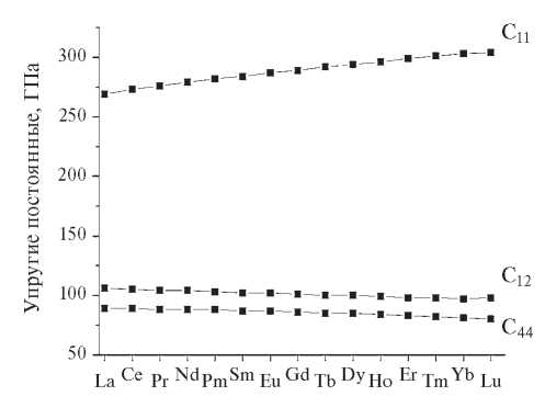 Изменение упругих постоянных цирконатов R2Zr2O7 в ряду La-Lu показано на рис. 1. Расчет предсказывает, что C11 увеличивается, а C12 и сдвиговая постоянная C44 уменьшаются.