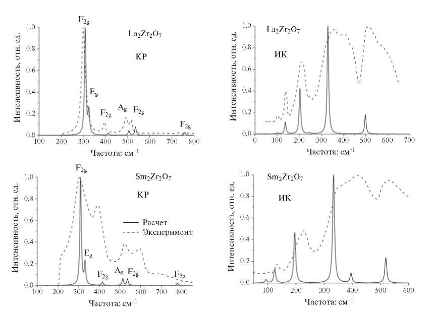 Кристалл R2Zr2O7 имеет набор мод: Г = A1g + + Eg + 2F1g + 4F2g + 3A2u + 3Eu + 8F1u + 4F2u. Моды A1g, Eg, 4F2g активны в комбинационном рассеянии, моды F1u – в ИК, одна из них трансляционная. Остальные моды «молчащие», они не активны ни в ИК, ни в КР. Расчет фононного был выполнен на примере Sm2Zr2O7. Результаты расчета в сравнении с имеющимися экспериментальными данными [24, 25] приведены в табл. 5. На рис. 2 представлены рассчитанный и полученный на эксперименте [25] КР спектр цирконата лантана La2Zr2O7. В программе CRYSTAL при моделировании спектров на основе полученных из расчета частот и интенсивностей ИК и КР мод используются лоренцианы, причем фактор затухания (damping factor) берется одинаковым для всех пиков, что ограничивает возможности моделирования. Поэтому мы приводим здесь сравнение только для КР спектра цирконата лантана, который, в отличие от КР-спектров других цирконатов, измеренных в работе [25], имеет узкие пики.