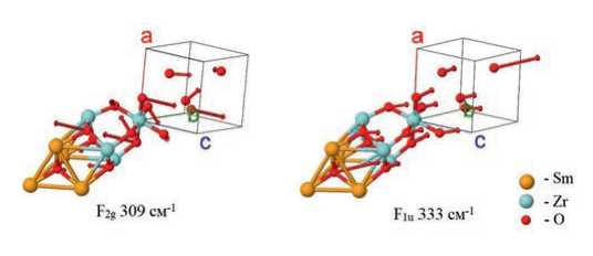 Согласно расчетам, происходит сильное смешивание колебаний структурных единиц. В ИК-активных модах участвуют все ионы R, Zr, O1 и O2, но степень участия некоторых может быть незначительна. Можно отметить преобладающее участие редкоземельного иона в низкочастотной «молчащей» моде Eu (89 см–1), и циркония в «молчащей» моде F2u (129 см–1).