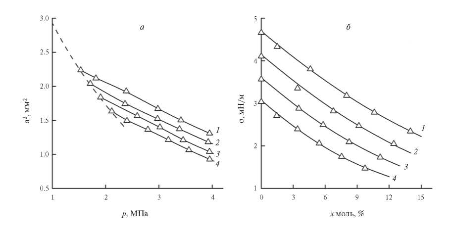 Рис. 1. Барическая зависимость капиллярной постоянной (а) и концентрационная зависимость поверхностного натяжения (б) раствора пропан–метан по изотермам. (1 – T = 318.15 К; 2–323.15; 3–328.15; 4–333.15).