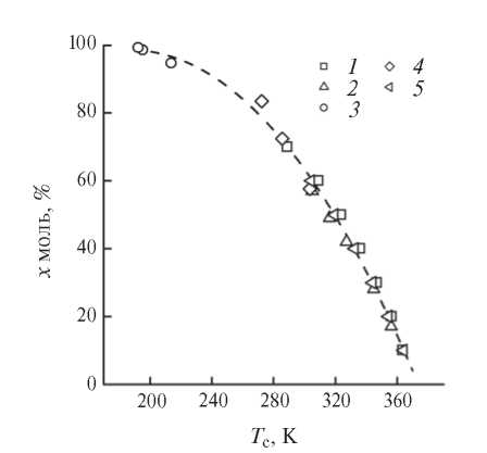 Рис. 3. Критическая линия раствора пропан–метан: 1 – [15]; 2 – [14]; 3 – [16]; 4 – [4], 5 – [17], пунктирная линия – данные, рассчитанные по уравнению (17).