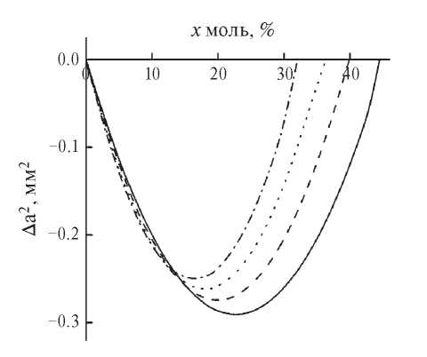 Рис. 4. Отклонение экспериментальных данных по капиллярной постоянной раствора пропан–метан от аддитивных значений, рассчитанных по уравнению (16): T = 318.15 K – сплошная линия; 323.15 K – штриховая линия; 328.15 K – пунктирная линия; 333.15 K – штрих-пунктирная линия.