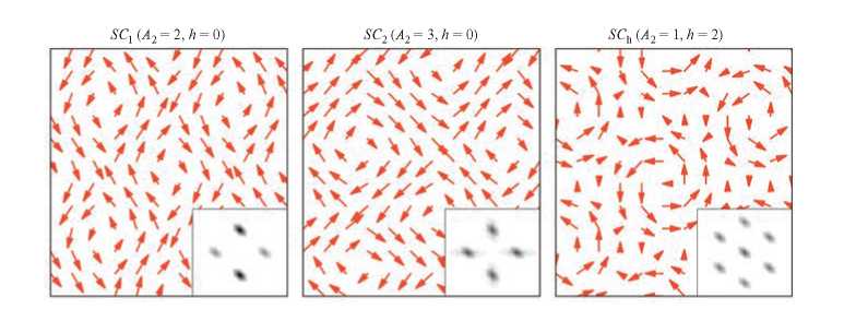 Варьируя параметры анизотропии и внешнего поля, можно добиться нескольких видов спиновых конфигураций. Фазовая диаграмма данной системы получена в работе [21]. В данной работе исследовались 3 скирмионные фазы с параметрами (A2, h) = = (2,0) – фаза SC1, (3,0) – фаза SC2, (1,2) – фаза SCh, имеющие различные спиновые конфигурации и профили интенсивностей, которые изображены на рис. 1 (при T = 0.01).