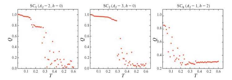 По зависимости Q(T) для фазы SC1 можно сделать вывод о том, что переход в парамагнитную фазу осуществлялся в 2 этапа. Рассмотрение зависимости Q(T) отдельно для каждой компоненты говорит о том, что при T < 0.1 фаза SC1 сохраняется, в промежутке от 0.1 до 0.2 пропадает упорядочение по оси x. При T > 0.3 начинает пропадать порядок и по оси y. При этой же температуре начинает разрушаться фаза SC2. Фаза SCℎ начинает разрушаться еще при температуре T < 0.1 и к T ≈ 0.3 переходит в ферромагнитную фазу.