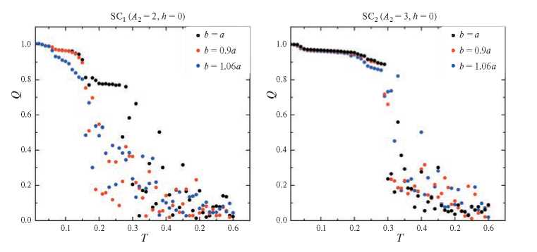 Влияние температуры на спиновую структуру можно исследовать с помощью определения параметра порядка, что непросто сделать для неколлинеарного расположения спинов [10]. Для этого необходимо провести сравнение спиновой конфигурации при температуре T на каждом шаге моделирования с основным состоянием системы. Далее нужно провести усреднение по всем шагам и по всем спинам. Таким образом, параметр порядка Q определяется аналогично параметру порядка Эдварда–Андерсона для спиновых стекол [22]: