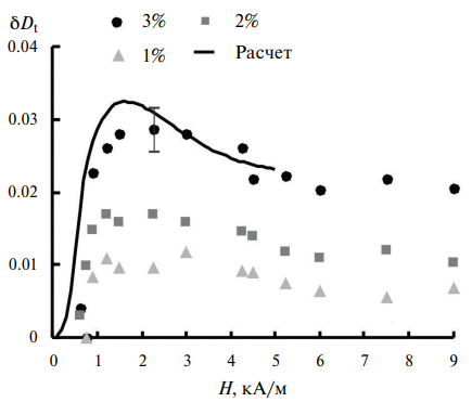 Было обнаружено, что на амплитуду магнитооптического эффекта изменения оптической плотности влияет концентрация капель МЖ в образце, а также напряженность действующего поля. На рис. 2 представлена зависимость от напряженности поля амплитудного значения изменения оптической плотности δDt (в данном случае под амплитудным значением мы подразумеваем значение параметра эффекта в момент прекращения действия магнитного поля, когда система находилась в состоянии близкому к насыщению в момент времени t = 6 c). Точки соответствуют экспериментальным значениям, а непрерывная линия — расчет, который будет обсуждаться далее. В эксперименте увеличение концентрации капель МЖ в образце приводит к увеличению амплитудных значений эффекта в диапазоне исследованных концентраций капель (до 3 %). Кроме того, полевая зависимость эффекта во всех образцах имеет немонотонный характер с максимумом в диапазоне от 1.5 до 2.3 кА/м. При дальнейшем увеличении напряженности величина эффекта достигает некоторого стационарного значения в полях свыше 6 кА/м.