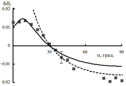 На рис. 3 представлены результаты исследования зависимости амплитудного значения изменения оптической плотности δDt при различных ориентациях магнитного поля относительно луча света. Исследования проводились с образцом эмульсии с концентрацией капель МЖ 1 %, воздействие магнитным полем осуществлялось импульсами длительностью t = 2 с и амплитудой 1.5 кА/м. Точками на графике обозначены экспериментальные значения, а непрерывная и прерывистая линии — расчет при разных параметрах размера микрокапель, межфазного натяжения и комплексного показателя преломления МЖ. Из представленной экспериментальной зависимости можно сделать вывод о том, что при изменении ориентации магнитного поля с продольной на поперечную параметр магнитооптического эффекта меняет знак. При угле ориентации поля относительно луча света около 30—40 градусов величина параметра эффекта близка к нулю.