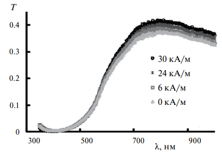Рис. 4. Влияние магнитного поля на спектры пропускания магнитной эмульсии.