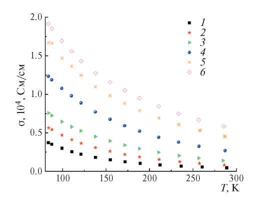 Рис. 1. Температурные зависимости удельной электропроводности кристаллов: 1 – Bi2Te3; 2 – Bi1.5Sb0.5Te3; 3 – Bi1.2Sb0.8Te3; 4 – Bi0.8Sb1.2Te3; 5 – Bi0.4Sb1.6Te3; 6 – Bi0.01Sb1.99Te3.
