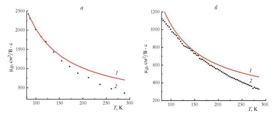 Рис. 4. Температурная зависимость холловской подвижности с учетом рассеяния на акустических фононах для кристалла Bi2Te3 (а) и кристалла Bi0.6Sb1.4Te3 (б): кривая 1 – теоретический расчет τ ~ T–1; кривая 2 – экспериментальная зависимость.