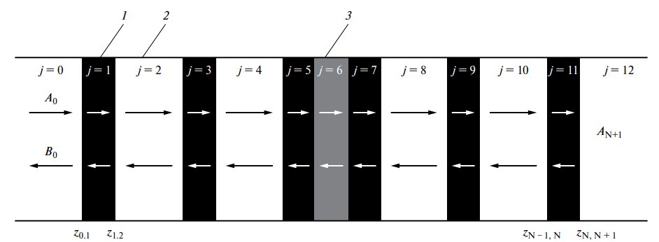 γ0 и γj постоянные распространения электромагнитной волны в вакууме и в слое с номером j, a — размер широкой стенки волновода, ω — частота электромагнитного излучения, ε0 и µ0 — электрическая и магнитная постоянные, εj и µj — диэлектрическая и магнитная проницаемости слоя с номером j, Aj, Bj — коэффициенты, определяющие амплитуды падающей и отраженной волны от слоя с номером j, z — расстояние от поверхности структуры, отсчитываемое вдоль направления распространения электромагнитной волны. Для фотонного кристалла, состоящего из 11 слоев, индекс j принимает целые значения от 0 до 12. Слои j=0 и j=12 соответствуют воздуху перед и после периодической структуры (рис. 1).