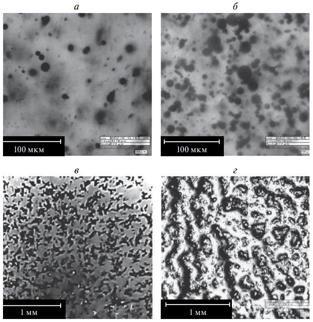Магнитная жидкость в эпоксидной смоле застывает в виде капель диаметром 10—50 мкм (рис. 2а). С увеличением объемной доли магнитной жидкости в композите концентрация и диаметр капель увеличивается (рис. 2б). При объемных долях свыше 0.2 композит представляет ячеистую структуру (рис. 2в). При высоких объемных долях более 0.3 происходит расслоение композита (рис. 2г).