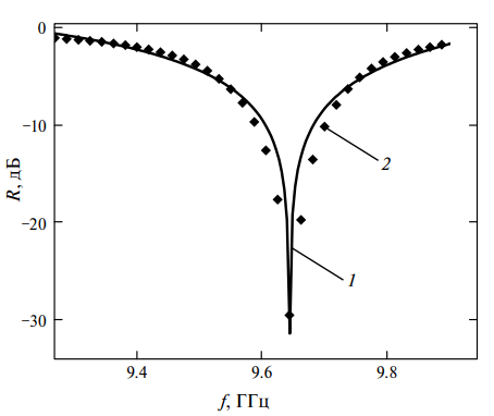 На рис. 3 представлены частотные зависимости коэффициента отражения от фотонного кристалла с использованием в качестве нарушенного слоя образца № 1.5. Теоретическая кривая рассчитывалась по предложенной модели эффективной объемной доли по формуле (7) с учетом (9) и (10). Объемная доля магнитной жидкости, вычислялась по формуле (12). Диэлектрическая проницаемость композита рассчитывалась по формуле (13), при этом использовались следующие параметры: εer = 3.2, εff = 3.6, PF = 0.74, (максимальная плотность упаковки сфер), А = 1.5 (сферические частицы). Видно согласование экспериментальных точек и теоретической кривой.