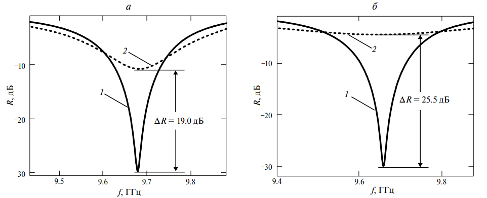 В отсутствии магнитного поля на частотных зависимостях коэффициента отражения СВЧ излучения имеется пик отражения в виде резкого минимума. При увеличении магнитного поля значение минимума коэффициента отражения начинает увеличиваться (рис. 4а).