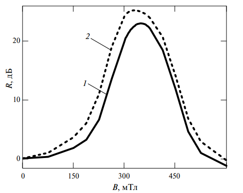 Зависимость изменения минимума коэффициента отражения ∆R от величины индукции магнитного поля показана на рис. 5. Значение ∆R вычисляется по формуле: