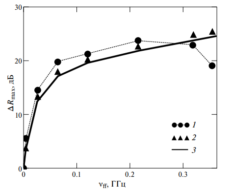 При некотором значении индукции магнитного поля BRmax, которое зависит от объемной доли магнитной жидкости в композите, изменение коэффициента отражения ∆R достигает максимального значения ∆Rmax. Зависимость величины подавления пика ∆Rmax от объемной доли магнитной жидкости vff изображена на рис. 6 (кривая 1).