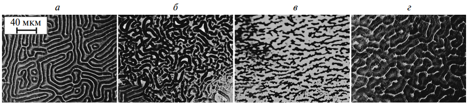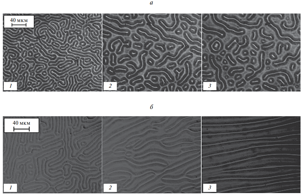 Дополнительно приложенное магнитное поле приводит к изменению характера структурной решетки. В качестве примера на рис. 3б показана трансформация структурной решетки лабиринтного типа, полученная в образце № 1 при воздействии электрического поля, в полосовую структуру при дополнительном воздействии однородного магнитного поля, направленного вдоль слоя образца.