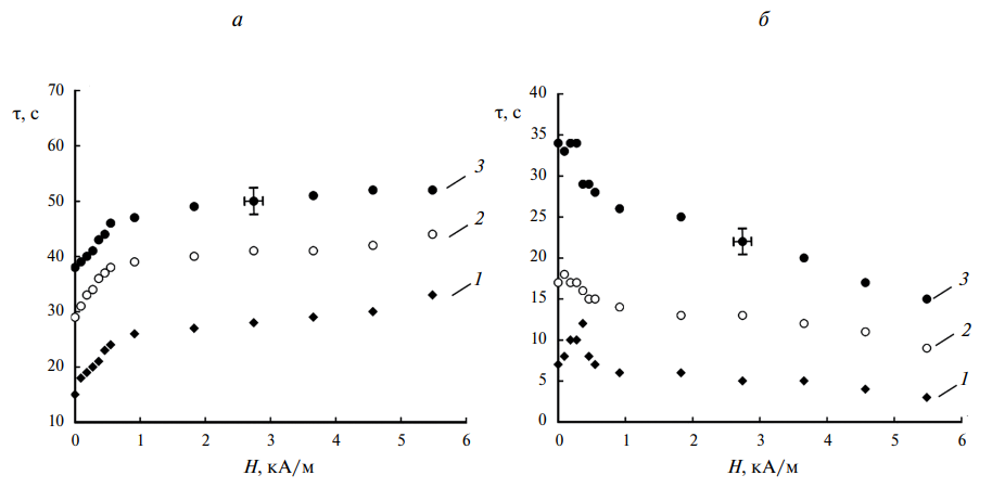 Рис. 4. Зависимость времени формирования структуры от напряженности магнитного поля, направленного перпендикулярно вектору электрического поля (а) и параллельно ему (б) при различной толщине слоя образца (1—6 мкм, 2—24 мкм, 3—36 мкм).
