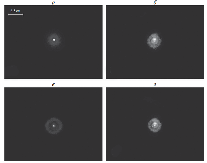 Рис. 6. Картины дифракционного рассеяния лазерного лучей разной мощности, полученные на экране после прохождения ими через тонкий слой магнитного коллоида (образец № 1), подверженный действию электрического поля, напряженность которого не превышает пороговое значение: при использовании маломощного лазера (слева) (а), лазера с большей мощностью (справа) (б), то же, при одновременном пропускании лучей обоих лазеров через одну и ту же область слоя (в, г).