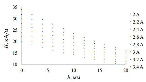 С помощью миллитесламетра ТПУ была получена зависимость напряженности магнитного поля соленоида от силы тока и расстояния до него, которая показана на рис. 2.
