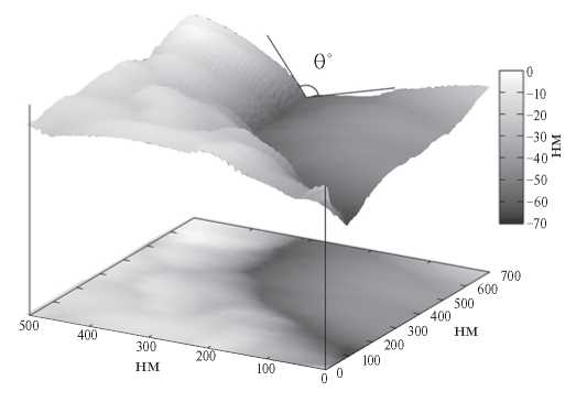 Рис. 1. Трехмерное СТМ-изображение канавки ГЗ и демонстрационная схема измерения двугранного угла q, необходимого для расчета значения относительной энергии ГЗ в точке измерения.