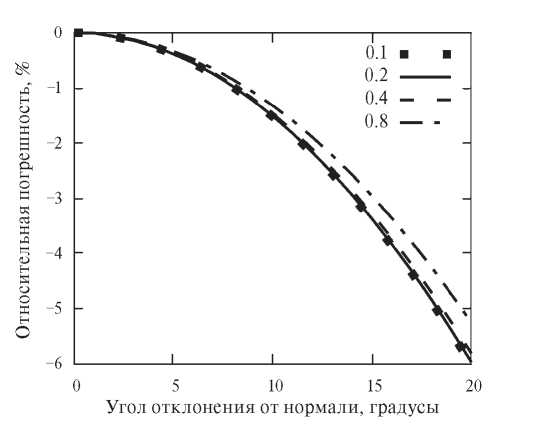 Оценка погрешности измерения, связанная с относительной произвольностью выбора угла нормали к линии ГЗ, представлена на рис. 2. График показывает, как увеличение отклонения от нормали влияет на погрешность результата при значениях энергий 0.1, 0.2, 0.4 и 0.8. При построении профиля канавки случайное отклонение угла сечения от нормали будет приводить к сдвигу измеренных значений двугранного угла в сторону больших значений и, соответственно, меньших энергий. При этом для границ, имеющих большую энергию, отклонение значений будет выше. Таким образом, «ручное» измерение, при котором выбор сечения строго к нормали маловероятен, неизбежно приводит к занижению значений относительных энергий ГЗ. Поэтому автоматизация процесса измерения профиля зернограничной канавки травления не только сводит к минимуму влияние человеческого фактора, но и позволяет повысить объем выборки, что также сказывается на надежности оценок величин относительной энергии ГЗ.
