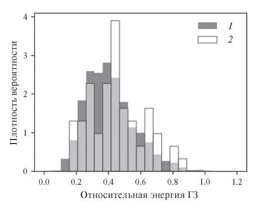 Рис. 4. Гистограммы распределений относительных энергий ГЗ, полученных с помощью алгоритмического подхода (1), в сравнении с результатами, полученными с помощью ручного метода (2).
