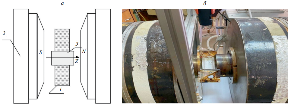 Для исследования динамики модельной среды в условиях комбинированных магнитных и механических воздействий была создана экспериментальная установка, схема и фотография которой представлена на рис. 1. Между полюсами электромагнита ФЛ-1 2 в область однородного магнитного поля перпендикулярно линиям магнитной индукции помещалась ячейка 1 из немагнитного и неэлектропроводного материала. Для исследования были созданы две экспериментальные ячейки. Ячейка № 1 использовалась для исследования поведения частиц магнетита и металлических шариков под воздействием магнитного поля, ячейка № 2 — для исследования динамики системы в условиях комбинированных магнитных и механических воздействий. Геометрические параметры ячеек: длина 110 мм, ширина 30 мм и высота 20 мм. Материалом для экспериментальных ячеек послужило оргстекло. Исследования проводились при комнатной температуре.