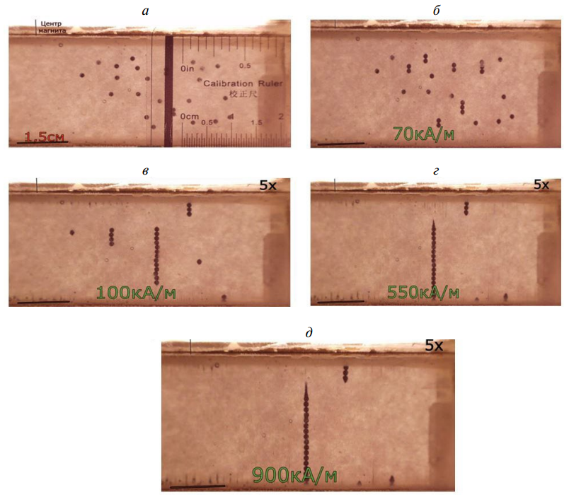 На рис. 4 представлено образование цепочечных структур при линейном распределении шариков. При включении магнитного поля частицы приходят в движение, начинают упорядочиваться шарики (рис. 4б), выстраиваясь в цепочки по два-три шарика. Затем (рис. 4в) выстраиваются мелкие частицы, происходит присоединение их к шарикам. На рис. 4г мелкие частицы выстроились в цепочки, мелкие цепочки из маленьких частиц объединяются в длинные, шарики образовали три цепочки — две содержат по 10 шариков и одна в центре состоит из 5 таких шариков. Рис. 4д показывает, что упорядочивание завершено. В данном эксперименте не происходит изменения числа цепочек в диапазоне увеличения напряженности магнитного поля от 400 до 1000 кА/м (рис. 5).