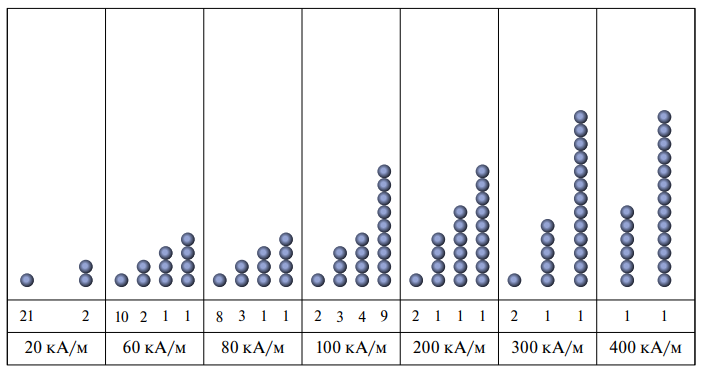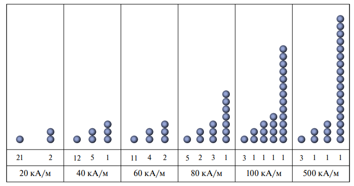 Рис. 4. Результат модельного эксперимента при линейном распределении шариков при различной напряженности магнитного поля.
