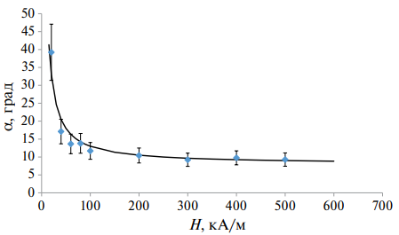 Во втором эксперименте происходит возбуждение колебаний в результате механического воздействия на модельную среду в ячейке в магнитном поле. При этом каждая цепочка частиц отклоняется от своего первоначального положения. На рис. 6 представлена зависимость распределения углов отклонения от положения равновесия цепочек частиц при колебательном воздействии при различном значении внешнего магнитного поля. При низкой напряженности поля угол отклонения цепочки частиц от положения равновесия максимальный.