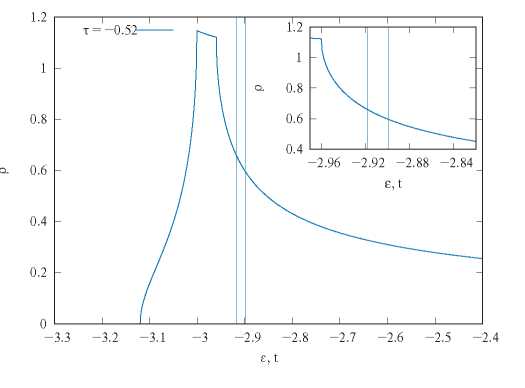 Рис. 1. Плотность состояний ρ(𝜖) при τ = −0.52. Вертикальными линиями ограничена область, где наблюдается метамагнитный переход при 𝑈 =1.50 𝑡. На вставке изображена область плотности состояний, где рассматривался метамагнетизм.